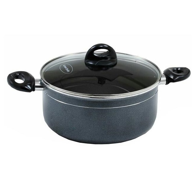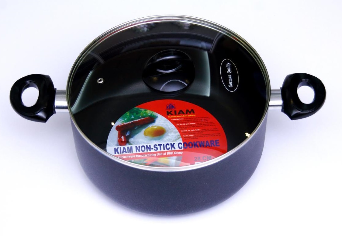 Kiam non stick casserole with glass lid strong handle and fire resist, carbon steel body with non stick coating. You can save 60% oil, ghee and butter. Attractive design and shap. From Germany. Good quality.