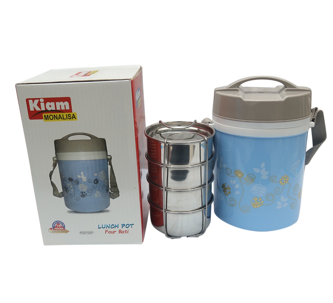 Kiam product of Monalisa lunch pot or lunch carrier- 4 bati. in side 4 steel pot with Best Quality Food Grade Virgin Plastic and Best Quality Insulating Material. Maximum Heat Retention Capacity (10 Hours). Good quality.
